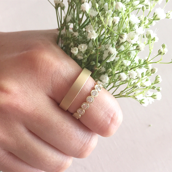 If you can choose your wedding ring and engagement ring together — even better! You only really need 3-4 months before your wedding date to ensure there’s plenty of time for your jeweler to make custom changes and size the ring. But if you can get them both together, that’s one less step to worry about in the middle of planning a wedding, and it means you don’t have to go hunting for something to match your engagement ring, especially if its unique.